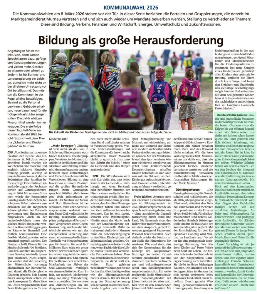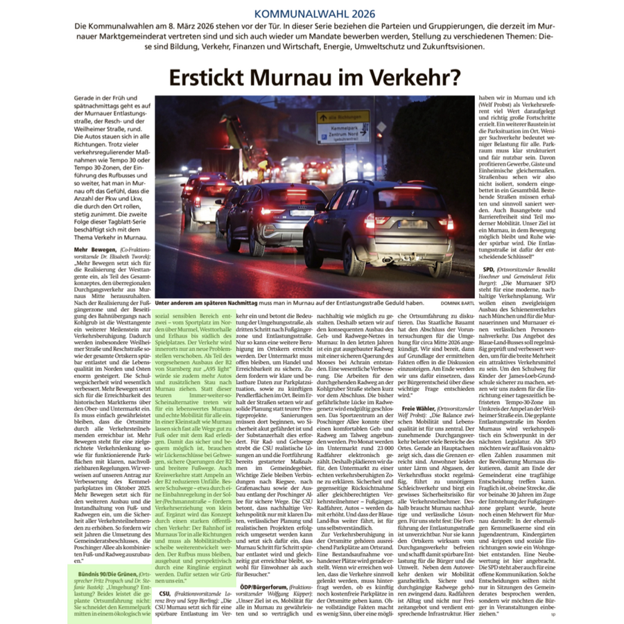 Im Murnauer Tagblatt ging diese Woche eine groß angelegte Serie zur Kommunalwahl 2026 an der Start. Hierfür wurden sämtliche kandierende Parteien in Murnau um eigene Beiträge zu diversen Themen angefragt. Selbstverständlich sind wir dieser Aufforderung nachgekommen. Schließlich wollen wir unsere Herzensthemen auch auf diesem Weg Kund tun.