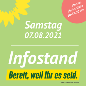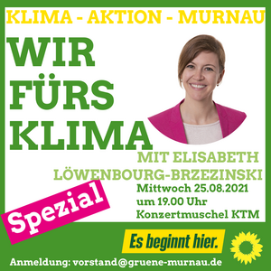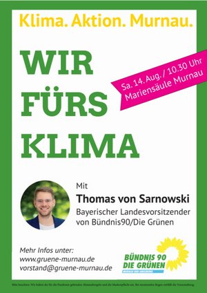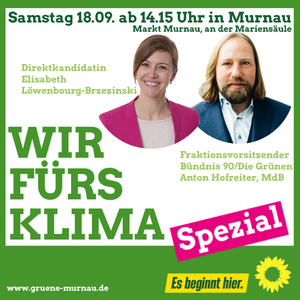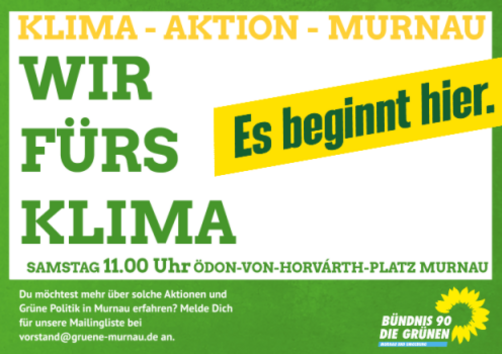 Infostand des OV Murnau & Umgebung ab 10.00 Uhr. Mahnwache `Wir Fürs Klima´ ab 14.15 Uhr mit Redebeiträgen von Anton Hofreiter, MdB, Fraktionsvorsitzender Bündnis 90/Die Grünen, Elisabeth Löwenbourg-Brzezinski und weiteren Unterstützer*innen.