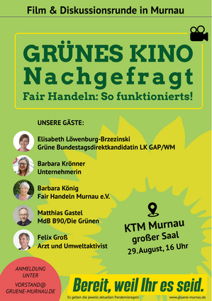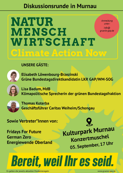 Gerne mit Voranmeldung unter vorstand@remove-this.gruene-murnau.de. Restplätze nach Verfügbarkeit. Der Eintritt ist frei. Wir beachten die Pandemieregeln am Veranstaltungstag.