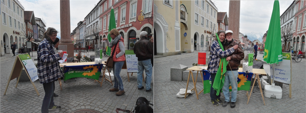 Doro Sührig, Sprecherin des OV: "Zu den urgrünen Themen, denen wir uns verpflichtet fühlen, gehört auf jeden Fall auch der kritische Blick auf den Individualverkehr. Autofreie Innenstädte sind dabei nur ein Aspekt. Die Erweiterung der Fußgängerzone in den Untermarkt wird nach unserer festen Überzeugung nicht nur die Attraktivität des Standortes erhöhen, sondern auch ein Stück mehr Lebensqualität nach Murnau bringen. Zu diesem Thema haben wir am Samstag, den 22. April einen Infostand inklusive einer nicht repräsentativen Abstimmung durchgeführt. Am Ende hatten wir nicht nur 195 Ja- zu 15 Nein- Stimmen, sondern haben in zahllosen Gesprächen erfahren können, dass dieses Thema den Bürger*innen am Herzen liegt. Wer kann sich an die Zeit erinnern, als der Last- und Individualverkehr noch durch den Obermarkt rauschte? Vielen Besuchern unseres Standes war das auch jetzt noch sehr gegenwärtig und nicht eine*r dachte gerne daran zurück. Wir sagen JA zur Fußgängerzone im Untermarkt!"