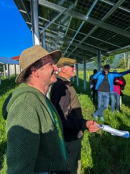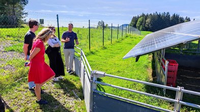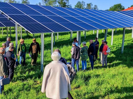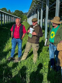 Bei strahlendem Sonnenschein und bester Anlagenauslastung gab es am Donnerstag, 13.06.2024 die erste Agri-PV-Anlage zu besichtigen. Der AK Energie der Grünen in Murnau & Umgebung lud ein und viele Besucher*innen waren da, um die neue, hoch aufgeständerte Agri PV-Anlage in Ohlstadt zu besichtigen. Der Vorteil dieser Form der Energieerzeugung liegt dabei auf der Hand. Das Land bleibt für die Landwirtschaft nutzbar. Dass sich dadurch auch die Bodenbeschaffenheit mittelfristig deutlich verbessert, ist ein zusätzlicher Faktor, den die Anlage mit sich bringt. Der Naturland Bauer Leonhard Zach, der zusammen mit der Energiegenossenschaft Oberland die Anlage umgesetzt hat, berichtete aus erster Hand über die Entstehungsgeschichte der innovativen Anlage.
