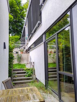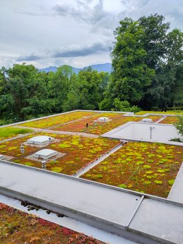 Für das Dach wurden vorhandene Stahlbänder genutzt mit einer Holzbalkenkonstruktion. 30 cm Dachdämmung, darauf ein Flachdach mit kompletter Dachbegrünung. Weiter geplant ist aktuell eine PV-Anlage auf das gesamte Dach.