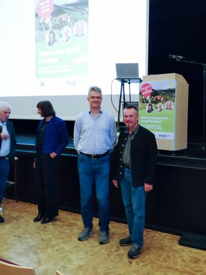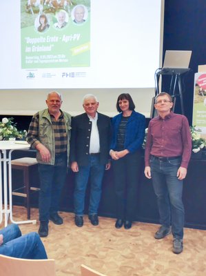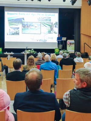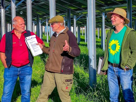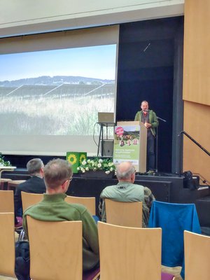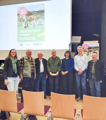 Zunächst wurden von den grünen Kandidaten zur Bezirkstagskandidaten Eckhart Stüber und vom Landtagskandidaten Gerhard Waas, die Bedeutung der Energiewende im Zeichen der Klimakatastrophe hervorgehoben. Im Anschluss fesselten die geladenen Expert*innen die Zuschauer*innen, die u.a. aus dem landwirtschaftlich- und kommunalpolitischen Bereichen kommend, dieses interessante Thema verfolgten. Das Publikum wurde umfangreich mit Sachinformationen und Handlungsoptionen von Professorin Dr. Kerstin Wydra von der FH Erfurt versorgt. Die Expertin glänzte in ihrem Vortrag nicht nur mit der wissenschaftlich fundierten Erläuterung der Rahmenbedingungen, Chancen und Konfliktfelder, sondern auch mit den zahlreichen Vorteilen der AgriPV: z.B. besseres Wiesen-Wachstum und Tierwohl durch die bei Hitze verdunstungshemmende Teilbeschattung der bewirtschafteten Wiesen.