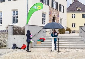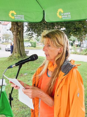 Für einen Schirm war es heute eindeutig zu windig, ansonsten hatte das Wetter ein Einsehen mit uns und unserem Anliegen. „WIR FÜRS KLIMA“, unsere Aktion mit Texten für und zum Thema Klima und Nachhaltigkeit wurde heute von zwei Frauen gestaltet. Birgit Hammer eröffnete als Versammlungsleitung und Ortsverbandssprecherin die Kundgebung. Dann übernahm Elisabeth Löwenbourg-Brzezinski, Grüne Direktkandidatin des Wahlkreises Garmisch-Partenkirchen-Weilheim-Schongau. Sie eröffnete die Lesung mit einem Gedicht und einem dazu passenden Text. Dann übernahm Birgit Hammer das Mikrofon, um ihren Text vorzutragen. Zum Abschluss hielt noch einmal die Direktkandidatin Elisabeth Löwenbourg-Brzezinski eine persönliche Rede. Die gelungene Gestaltung und die ansprechenden Beiträge kamen sehr gut bei den Zuhörer*innen an.