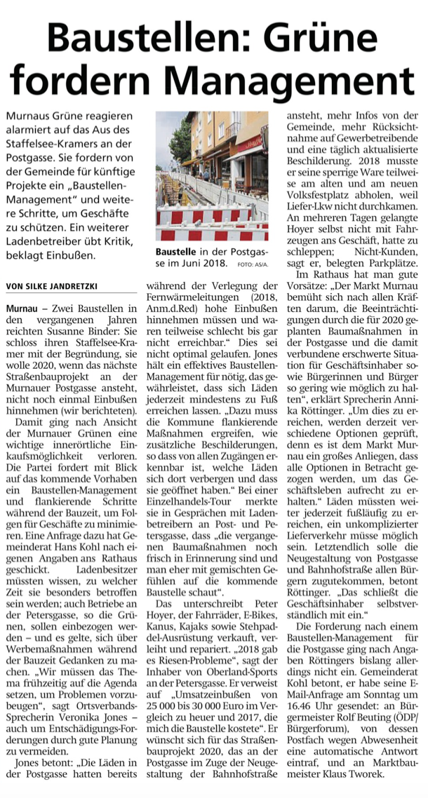 Der Artikel "Baustellen: Grüne fordern Management" erschien am 20.08.2019 im Murnauer Tagblatt.