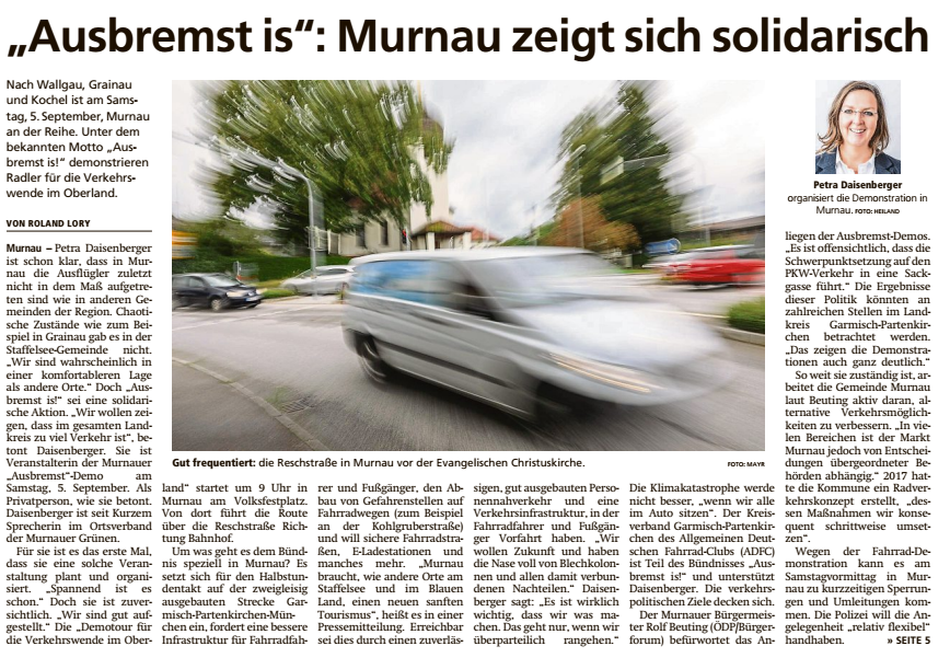 Berichterstattung zu Fahrraddemo "Ausbremst is" - Erschienen im Murnauer Tagblatt am 03. September 2020.
