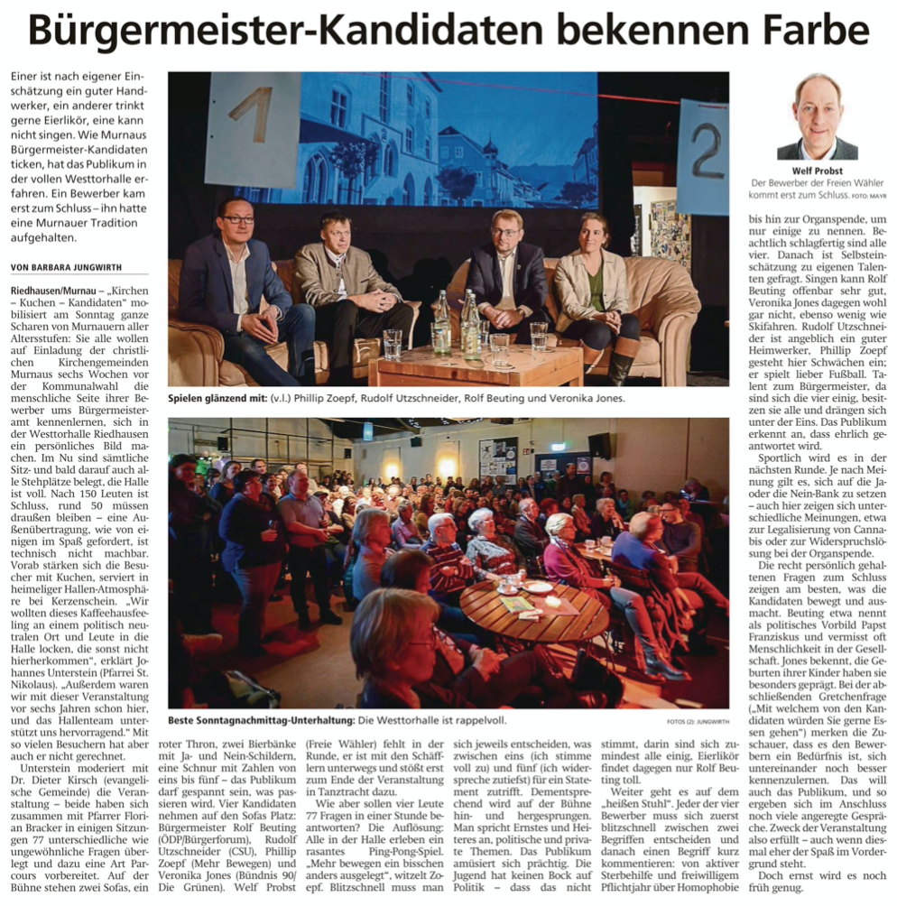 Berichterstattung zur Veranstaltung "Kirchen, Kuchen, Kandidaten", der kirchengemeinden Murnaus in der Westtor am Sonntag, den 2. Februar 2020.