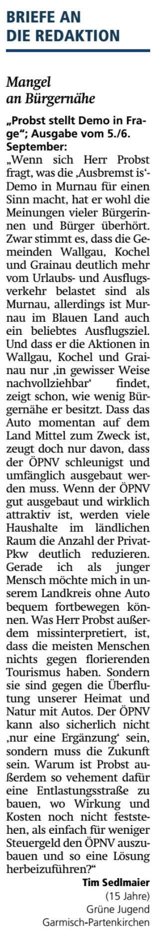 Leserbrief zu Artikel "Probst stellt Demo in Frage" - Erschienen im Murnauer Tagblatt am 10. September 2020.