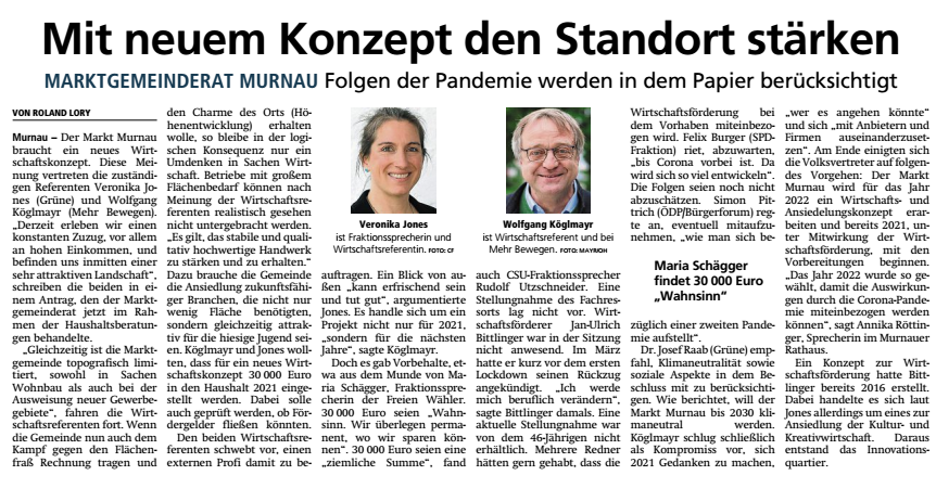 Berichterstattung zum Wirtschaftskonzept - Erschienen im Murnauer Tagblatt am 05. Dezember 2020